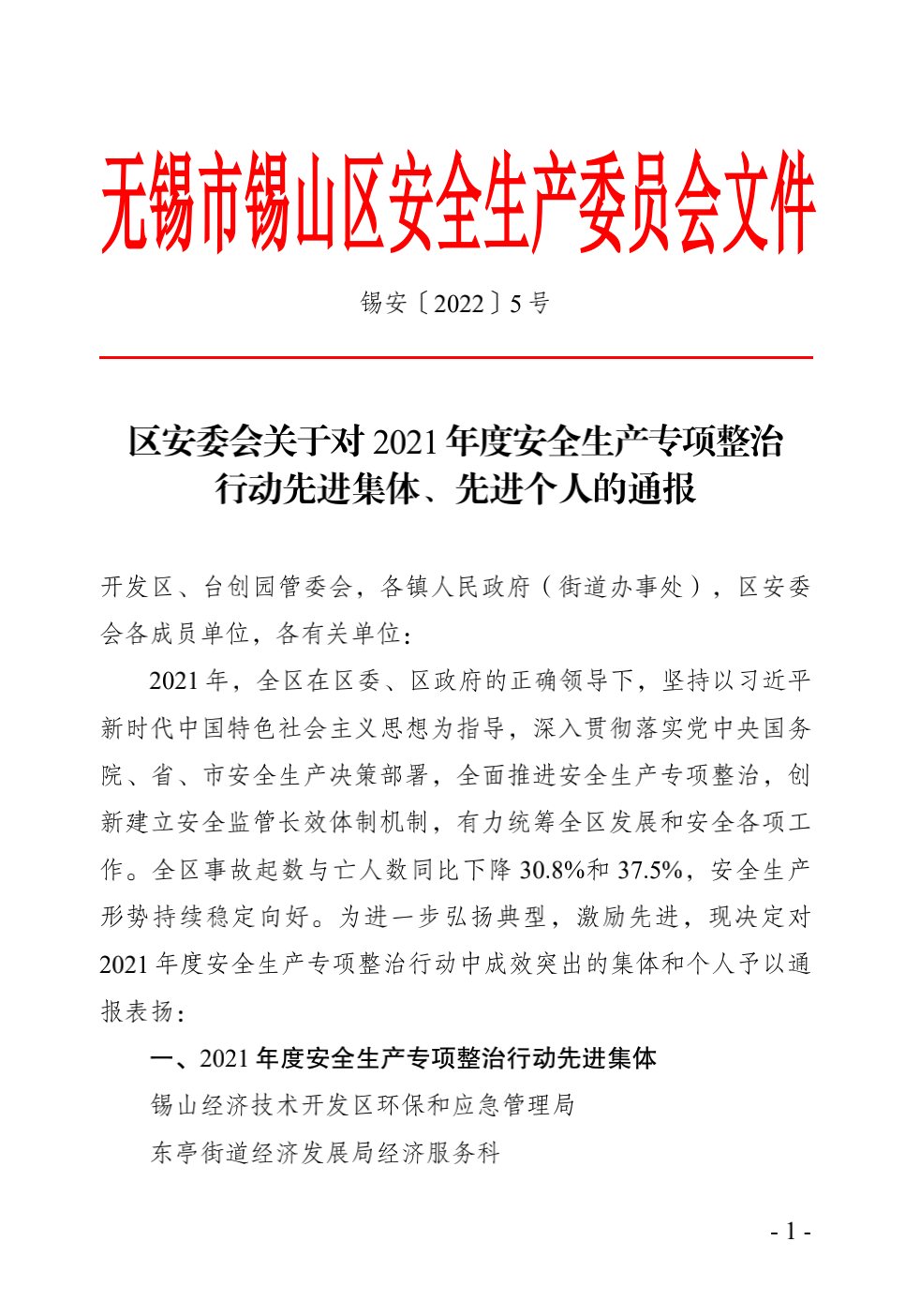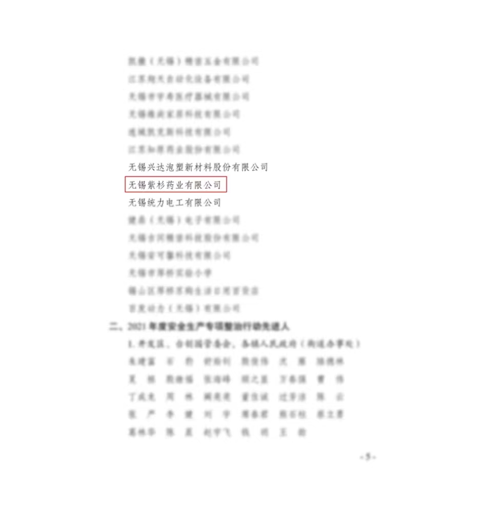 近期,无锡市锡山区安全生产委员会印发《区安委会关于对 2021年度安全生产专项整治行动先进集体、先进个人的通报》,无锡紫杉药业有限公司荣获“2021年度安全生产专项整治行动先进集体”荣誉称号。